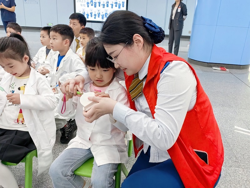 換上白大褂,變身“小牙醫(yī)”。5月8日下午,鄭州地鐵12號(hào)線聯(lián)合愛康體檢中心與金水區(qū)常春藤幼兒園在黃河南路站開展“萌娃變身牙醫(yī) 守護(hù)健康微笑”活動(dòng)。一群小萌娃進(jìn)入地鐵站開啟了關(guān)于口腔健康的“探索之旅”!