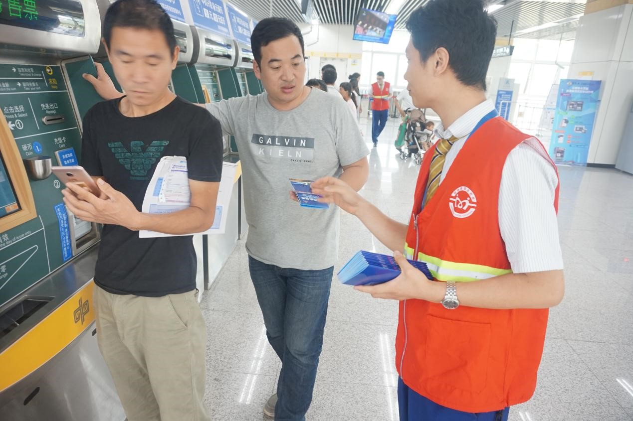 2017年5月19日,鄭州市軌道交通有限公司運營分公司站務(wù)三室第二黨支部于孟莊站開展“自覺排隊,文明候車”活動,全體黨員手持排隊候車手舉牌,每人負責兩個車門,利用行車間隔,引導乘客排隊候車。