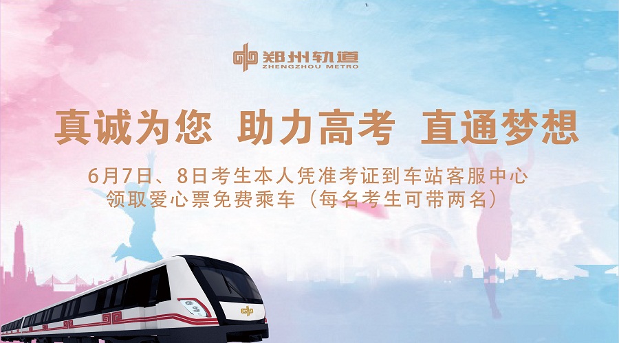 為給考生創(chuàng)造良好乘車環(huán)境,助力考生創(chuàng)佳績(jī),鄭州地鐵將于6月7日、8日兩天開展2017年愛心助考活動(dòng)。 設(shè)置助考站,愛心用品免費(fèi)發(fā) 此次活動(dòng)選取10個(gè)車站為愛心助考車站,分別是:(1號(hào)線)秦嶺路站、五一公園站、綠城廣場(chǎng)站、醫(yī)學(xué)院站、鄭州火車站、紫荊山站、黃河南路站;(2號(hào)線)關(guān)虎屯站、東大街站、南五里堡站。