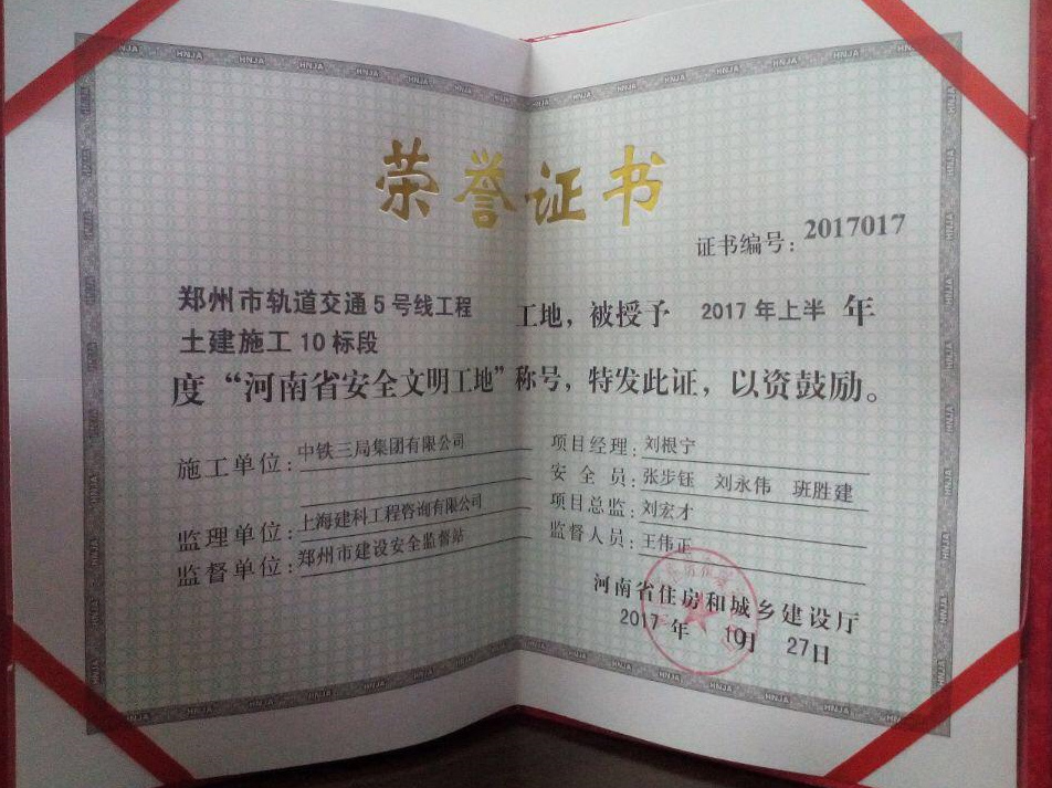 鄭州市軌道交通5號線土建10標 被授予“河南省安全文明工地”稱號